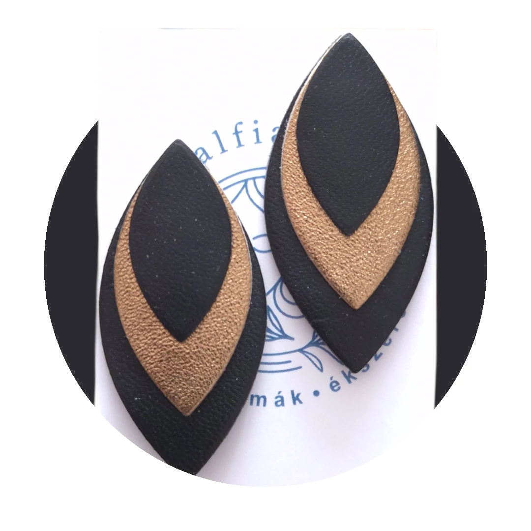 Arany-fekete bedugós bőr fülbevaló, sziromlevél