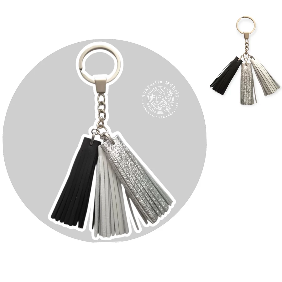 Fehér-ezüst-fekete bőr kulcstartó, rojttal