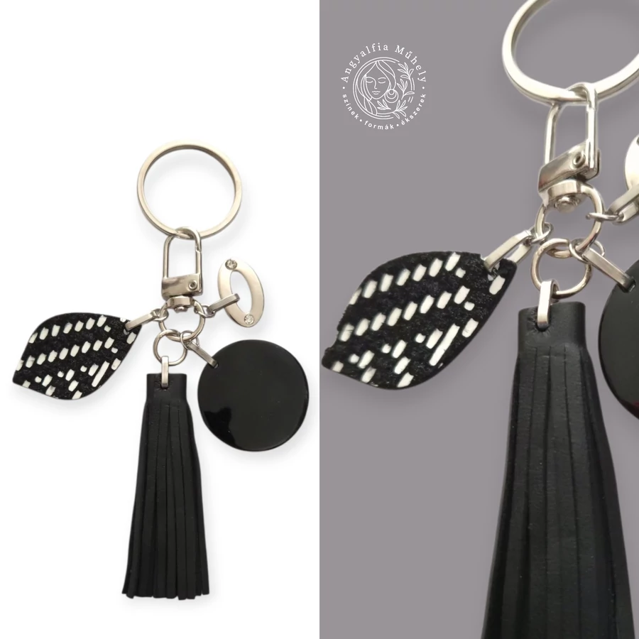 Fekete-fehér bőr táskadísz és kulcstartó