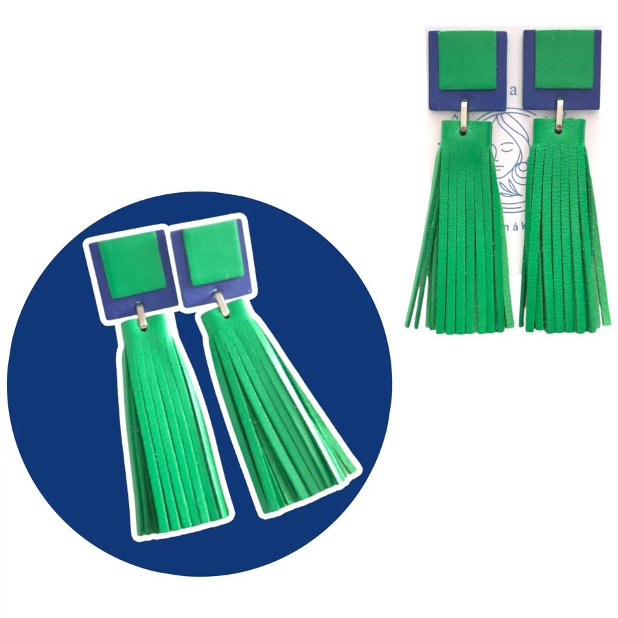 Fűzöld-kék bedugós-rojtos bőr fülbevaló