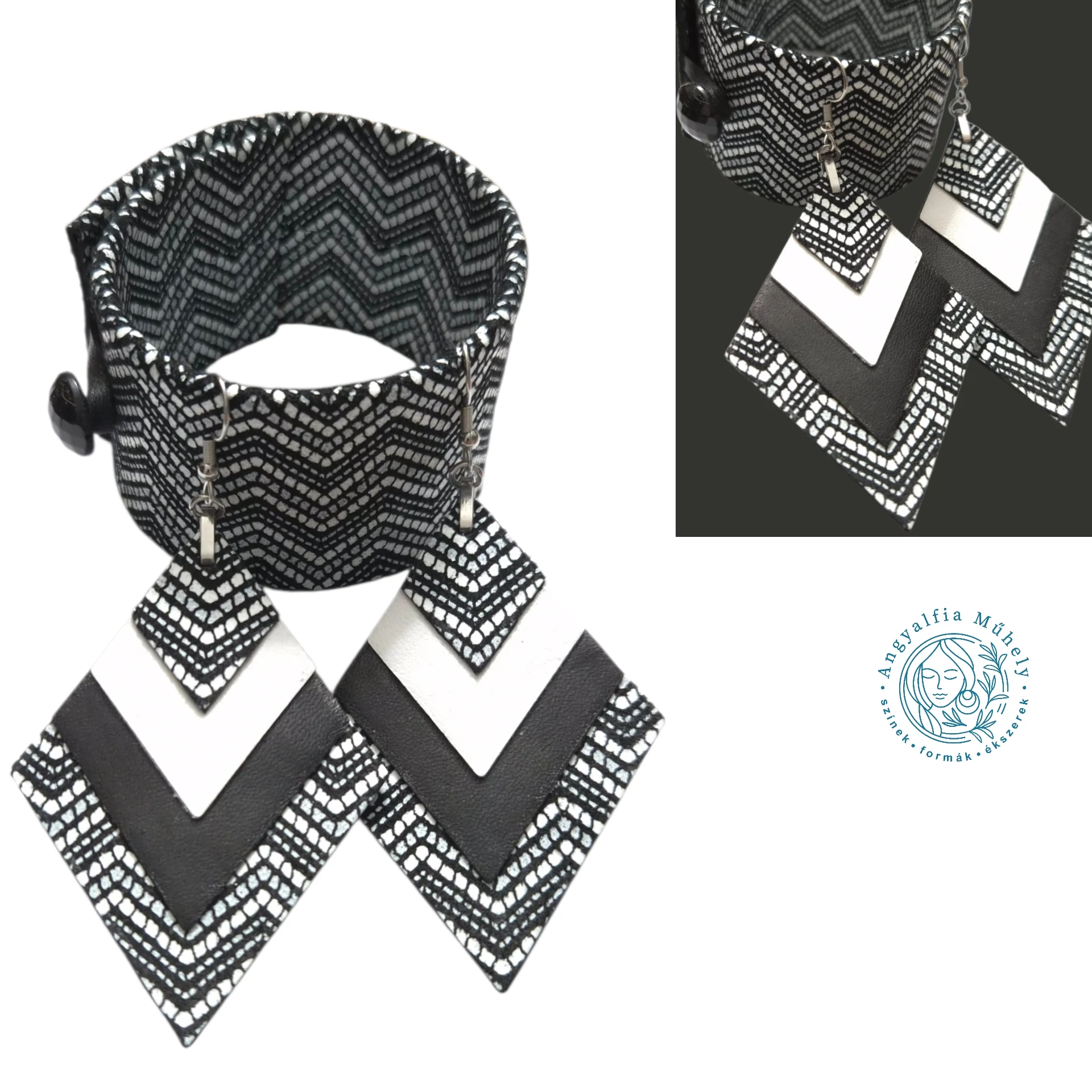 Geometrikus, mintázott fekete-fehér ékszerszett
