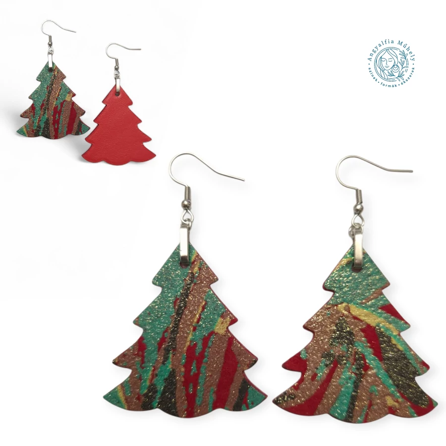 Különleges karácsonyfa bőr fülbevaló, arany csillogással