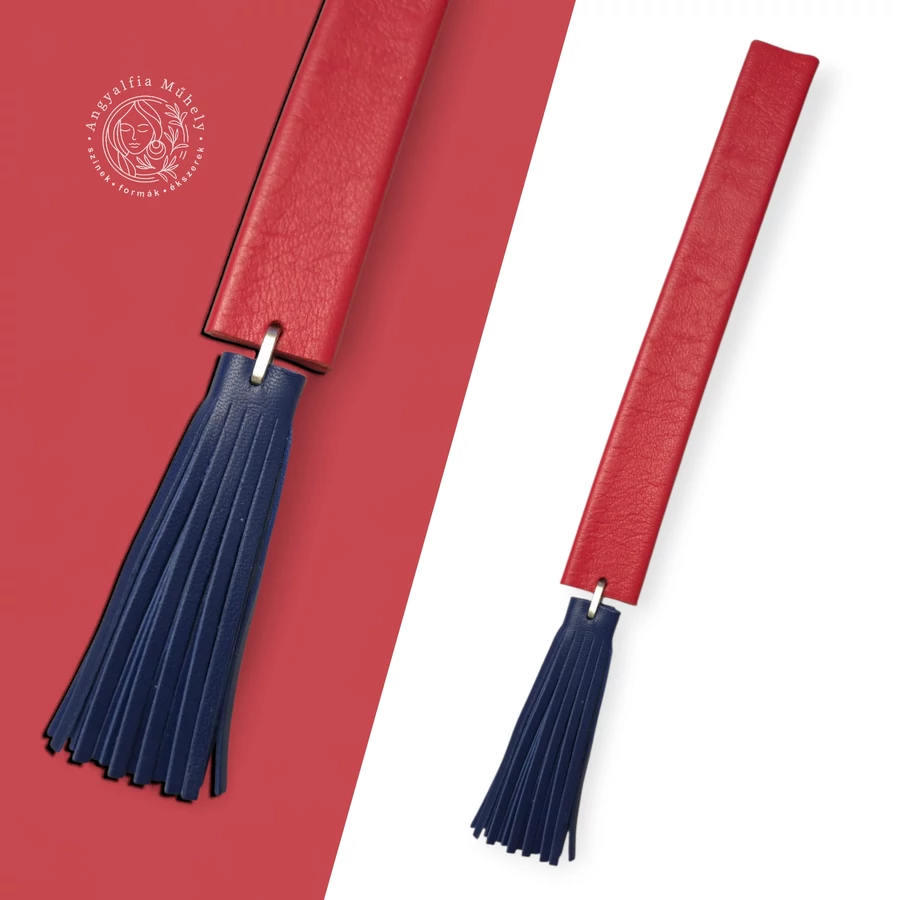 Olvasni jó! bőr könyvjelző, rojttal piros-kék színekben