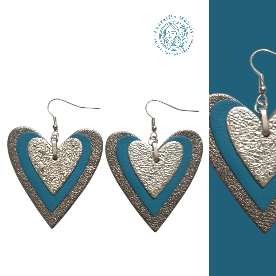 Türkizkék-grafit Kisszívem bőr fülbevaló, ezüsttel